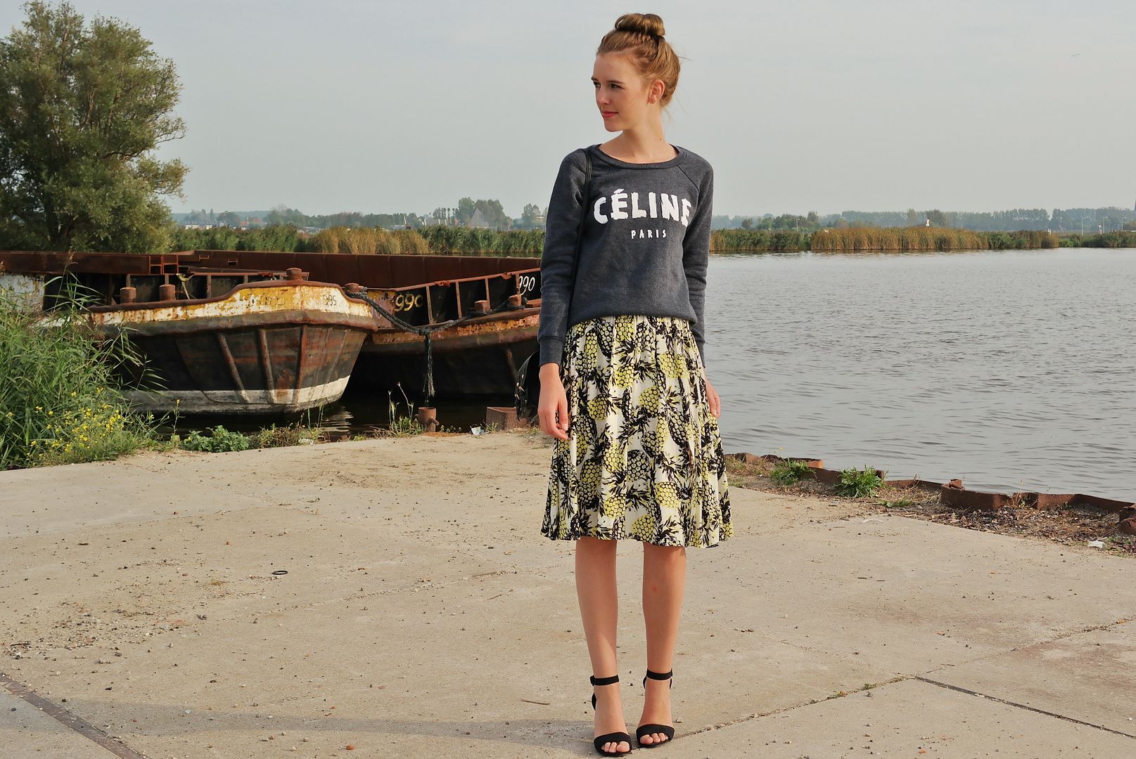 While I prefer a bodycon midi skirt, I must admit that I love this wide pineapple printed skirt from Primark. I already wore it previously on the blog, you can see the outfit post here. Ofcourse this skirt is also perfect for the autumn weather, like we had these past couple of days. Therefor I'm wearing it with a cute Celine sweater which I found in the thriftstore (lucky me!) What do you think of this combination?