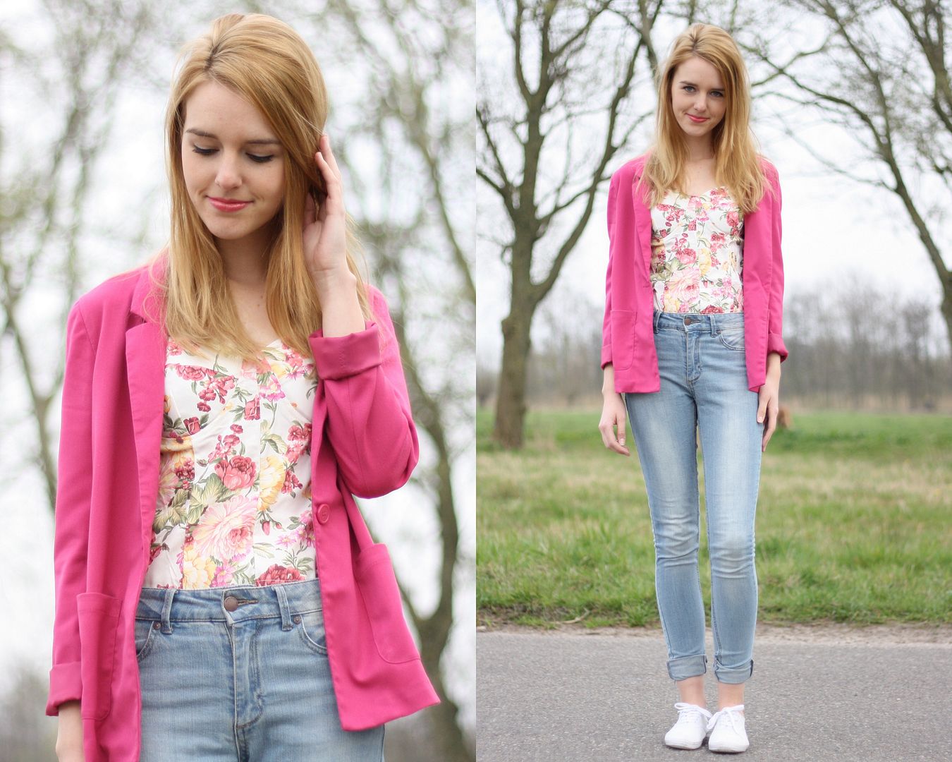 Today I'm wearing a floral bustier top which was a gift from Choies, having a fashion blog gives me lovely opportunities to review great stuff. I'm very happy with this top: it fits perfectly and is easy to wear with a high waisted skinnyjeans. Besides that I'm wearing a pink boyfriend blazer which I bought in the thriftstore. It was really cheap: just 4 euro! And if I also tell you that my skinnyjeans (10 euro) and shoes (3 euro) are from Primark, you can understand that this is a true budget outfit :)