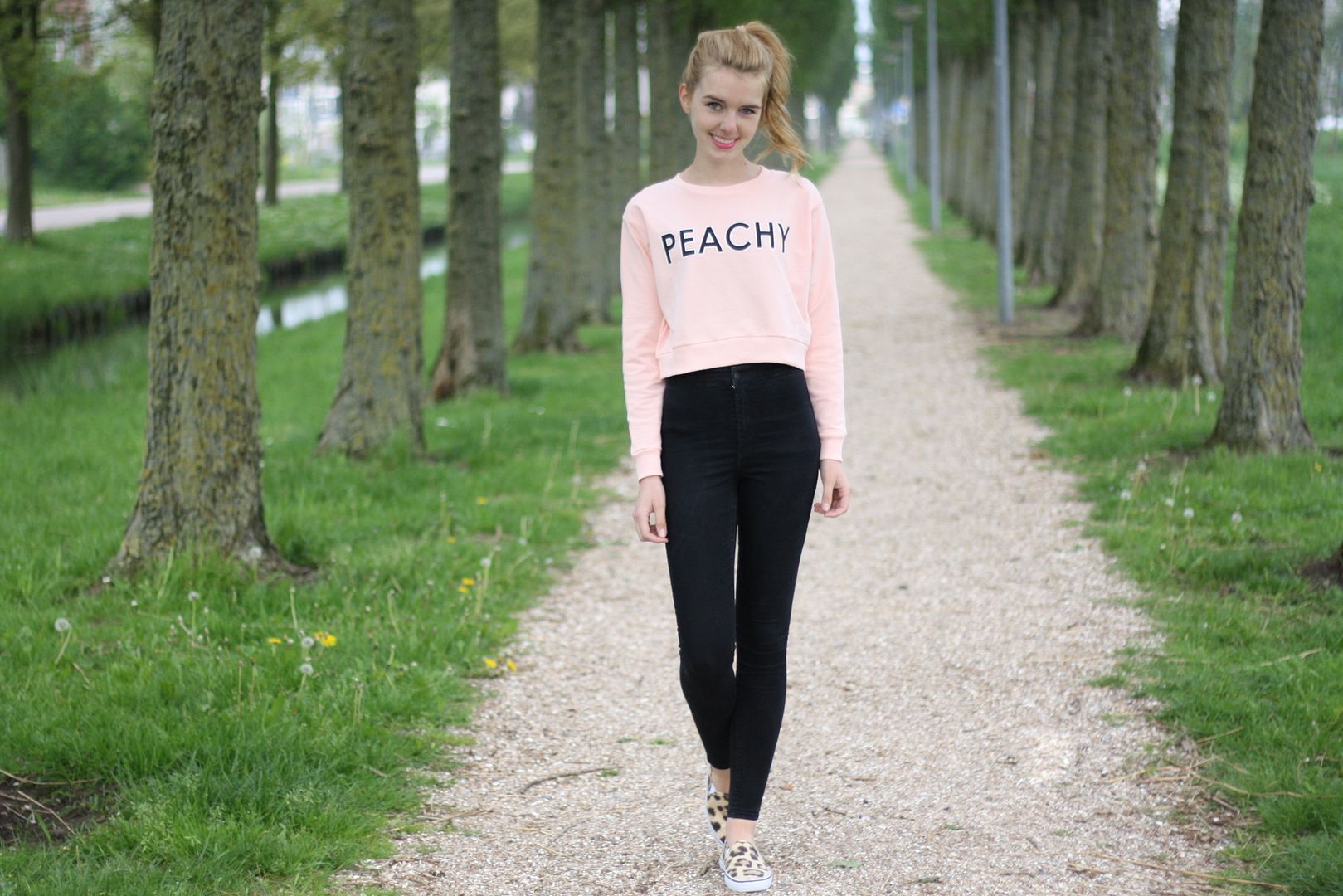 I might be 25 years old, but I'm madly in love with the divided section of H&M. Correct me if I'm wrong but I think it's more for teenagers, which I'm not, but I don't care. I always find cute items from this section. And also my love for croptops and cropped sweaters is growing and developing even more. This cropped sweater (peach!) is from the H&M divided section and I found it in sale a while ago. I'm wearing it with my all time favorite high waisted skinnyjeans from topshop, Joni. And ofcourse my favorite shoes as well, the leopard slip ons from H&M.